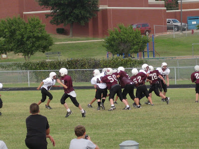 This is what happens when 100 7th graders sign up for football. Next year it won't be as crowded because these boys aren't going to make the same mistake twice and sign up again! Anthony will though, he doesn't mind getting up at 6 or even 5 to go lift weights or head to practice. He loves football. Well playing it anyways!